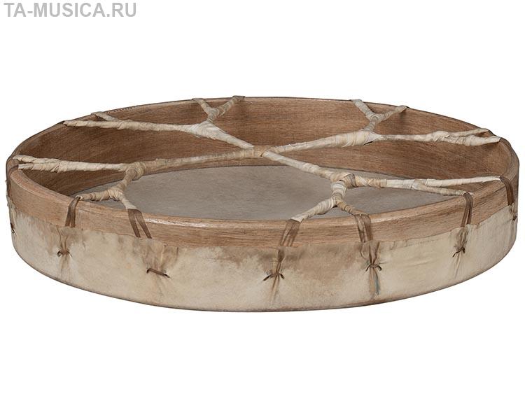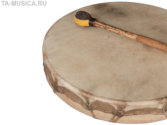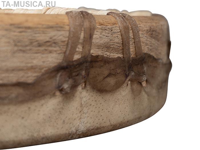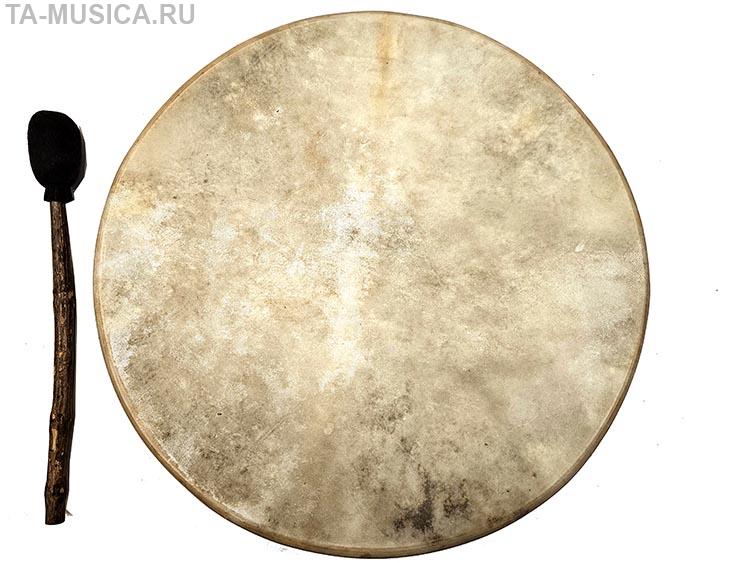 Большой бубен диагональю 50 см, кожа довольно тонкой выделки, натянута сильно, потому несмотря на свой размер бубен выдает целый спектр высоких обертонов в зависимости от силы и места удара по мембране, впрочем и с басом тоже все в порядке.
