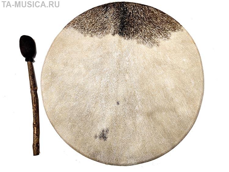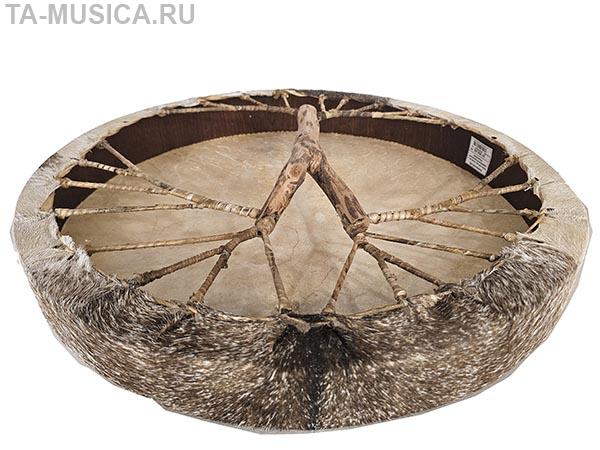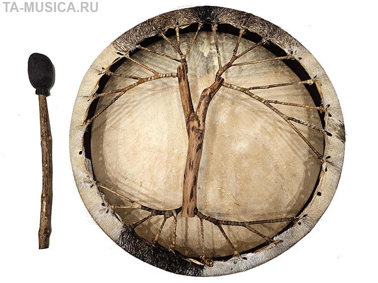 Большой низкий бубен за счет своих размеров довольно низок в звучании, при этом выделка кожи довольно тонкая, поэтому бубен хорошо откликается на на удары по всему контуру, дает многочисленные призвуки, обертона.