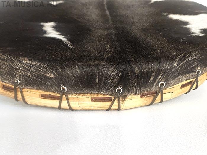 Мастеровой бубен диаметром 50 см, материал дерево и кожа козы. Громкий, с отчетливым длинным и бархатистым басом, с хорошим диапазоном звуков от центра к краю, внутри рамы сделана система веревочной подтяжки кожи, благодаря которой, можно за минуту изменить звук бубна. Кожа средней толщины.